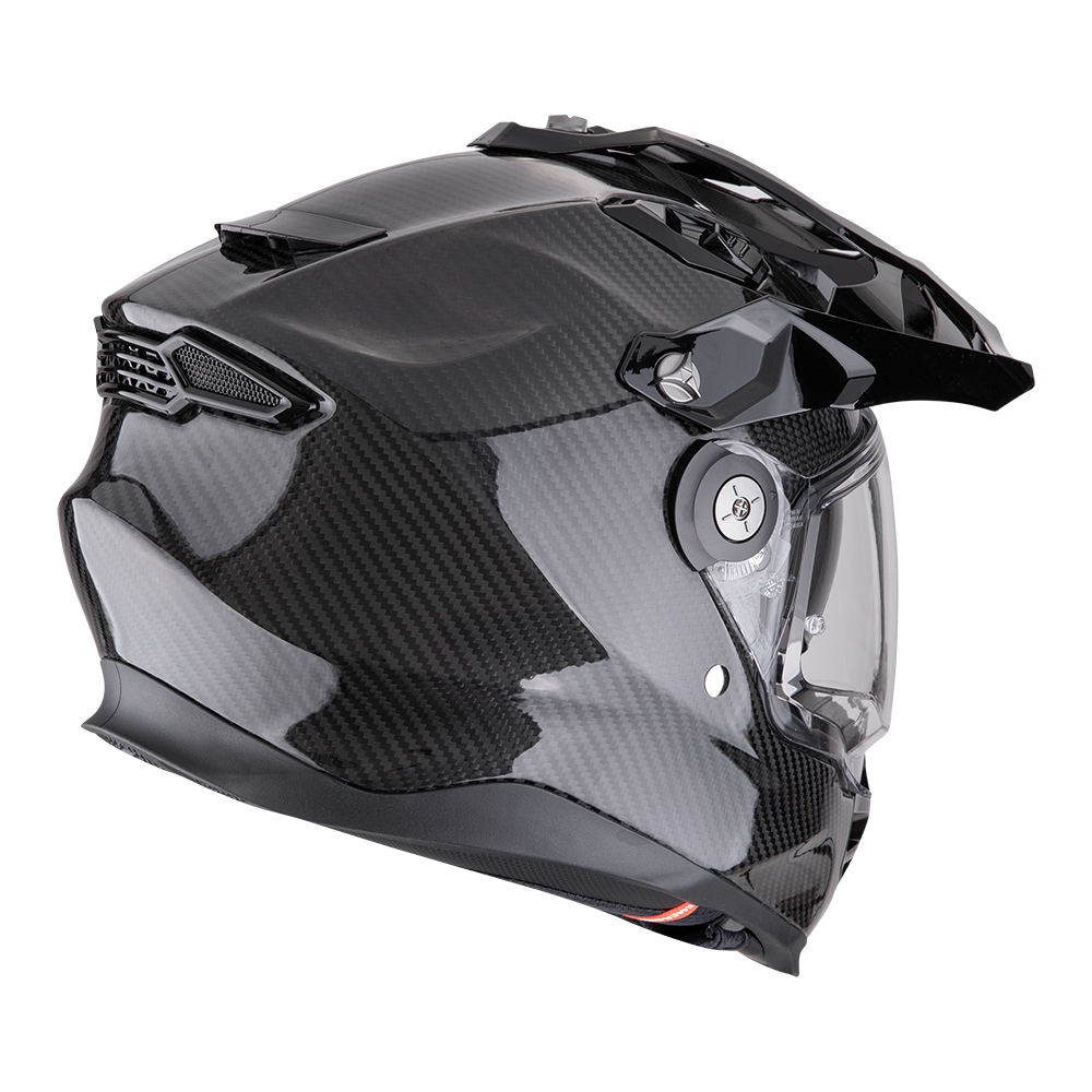 Presentamos el nueva ADF-9000 Carbon Air Edition, creada para el piloto aventurero dedicado. Este modelo mejorado incorpora una robusta y ligera carcasa de fibra de carbono, que la eleva por encima de su predecesora. Construido con la avanzada tecnología TCT Ultra, el ADF-9000 Carbon Air Edition ofrece una durabilidad superior y un peso mínimo. Cada casco está meticulosamente fabricado para ofrecer la máxima calidad. La visera Exolon® Peak, fabricada con material resistente a las roturas, reduce las sacudidas a altas velocidades y puede retirarse fácilmente para circular por autopista o en condiciones de poco sol. Para las aventuras fuera de la carretera, el casco incluye un sistema de extracción de la pantalla facial sin herramientas, que permite una rápida transición a las gafas. El amplio puerto ocular mejora la visión periférica y se adapta a la mayoría de tamaños y marcas de gafas. Una característica distintiva de los cascos ScorpionEXO es el sistema de inflado del forro AirFit®, que permite un ajuste personalizado de las almohadillas de las mejillas para reducir el ruido del viento y la elevación. Tanto si se enfrenta a rutas globales como a paseos casuales, el ADF-9000 Carbon Air Edition ofrece un confort, una seguridad y una confianza excepcionales, lo que lo convierte en el casco definitivo para todo tipo de carreteras y climas. La nueva calota de fibra de carbono lo lleva al siguiente nivel, proporcionando una resistencia y ligereza inigualables para cualquier terreno.