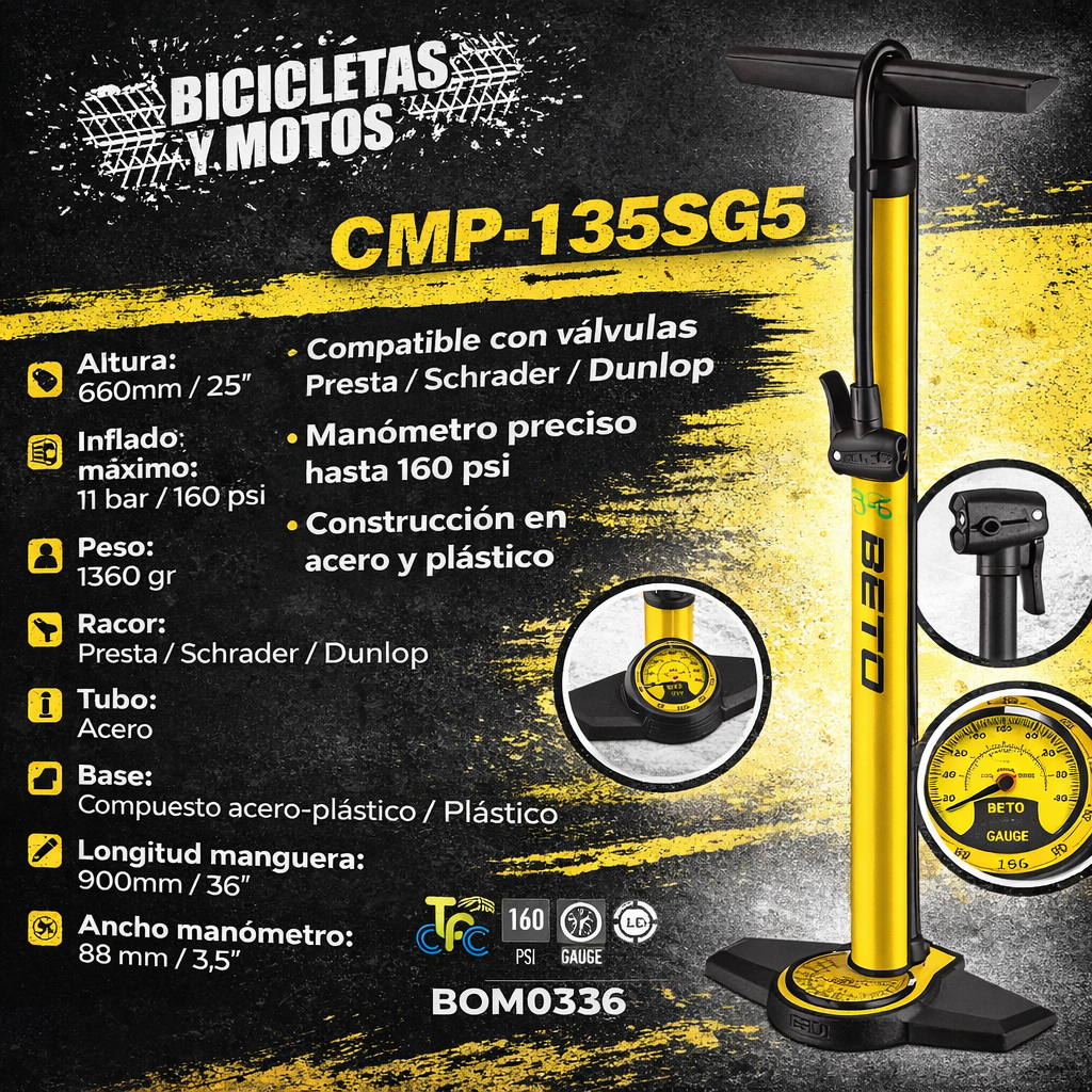 El inflador BETO CMP-135SG5 es ideal para ciclistas de ruta, MTB, BMX y usuarios de motocicletas que necesitan una bomba de aire confiable, potente y fácil de usar, con compatibilidad total de válvulas.