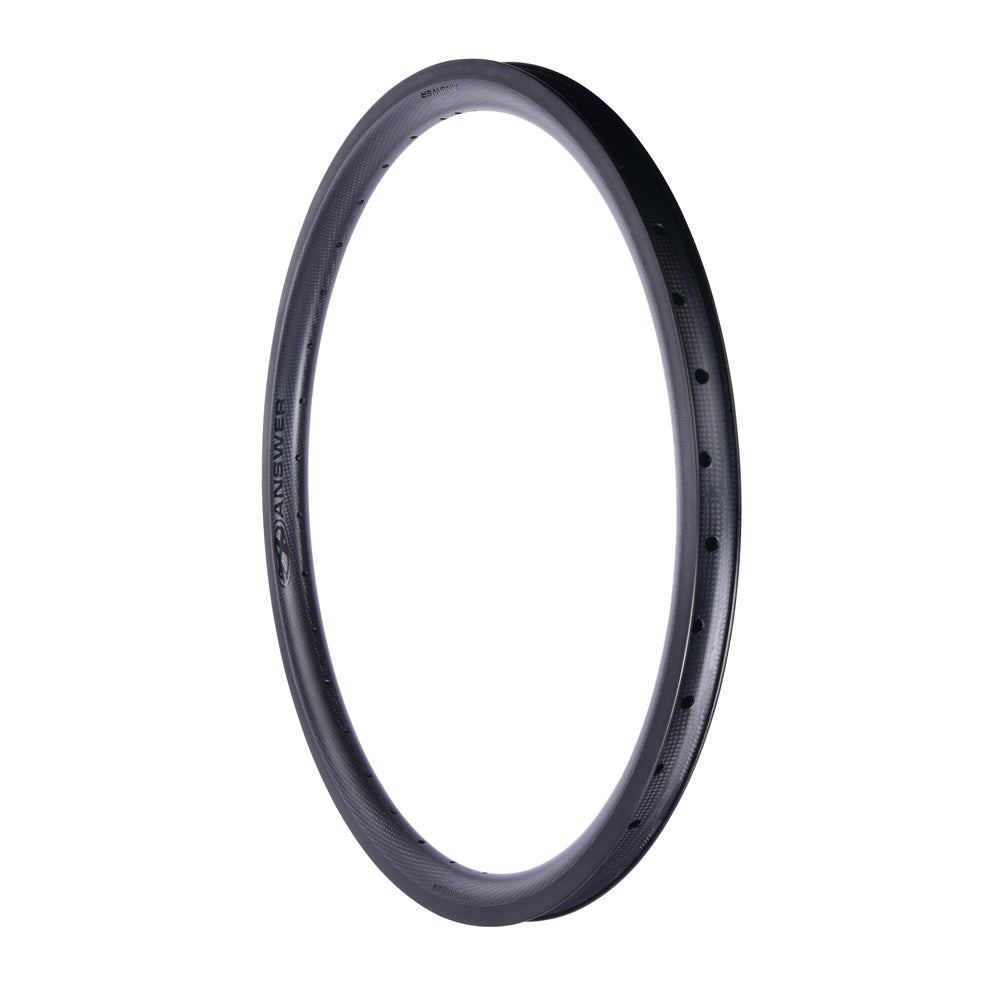 Las llantas de carbono Answer están fabricadas con un tejido negro mate de 3k con logotipos en negro brillante. Las llantas traseras tienen una superficie de frenado adicional. Las llantas delanteras se pueden usar en la parte trasera para aplicación de disco