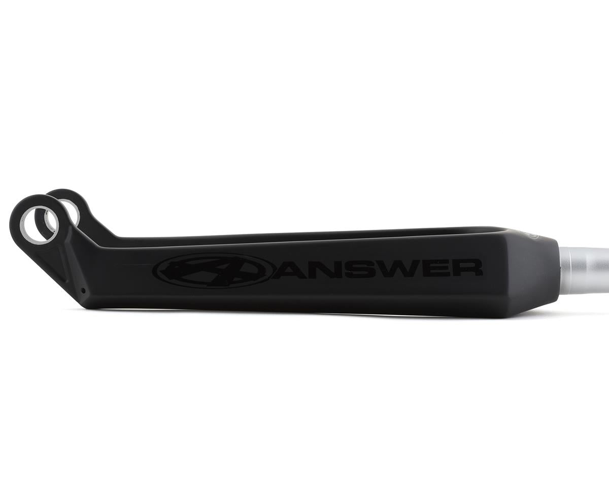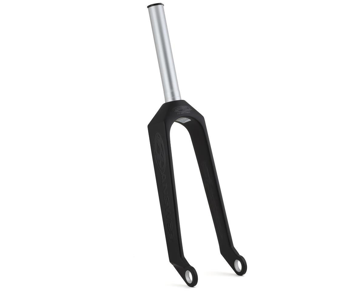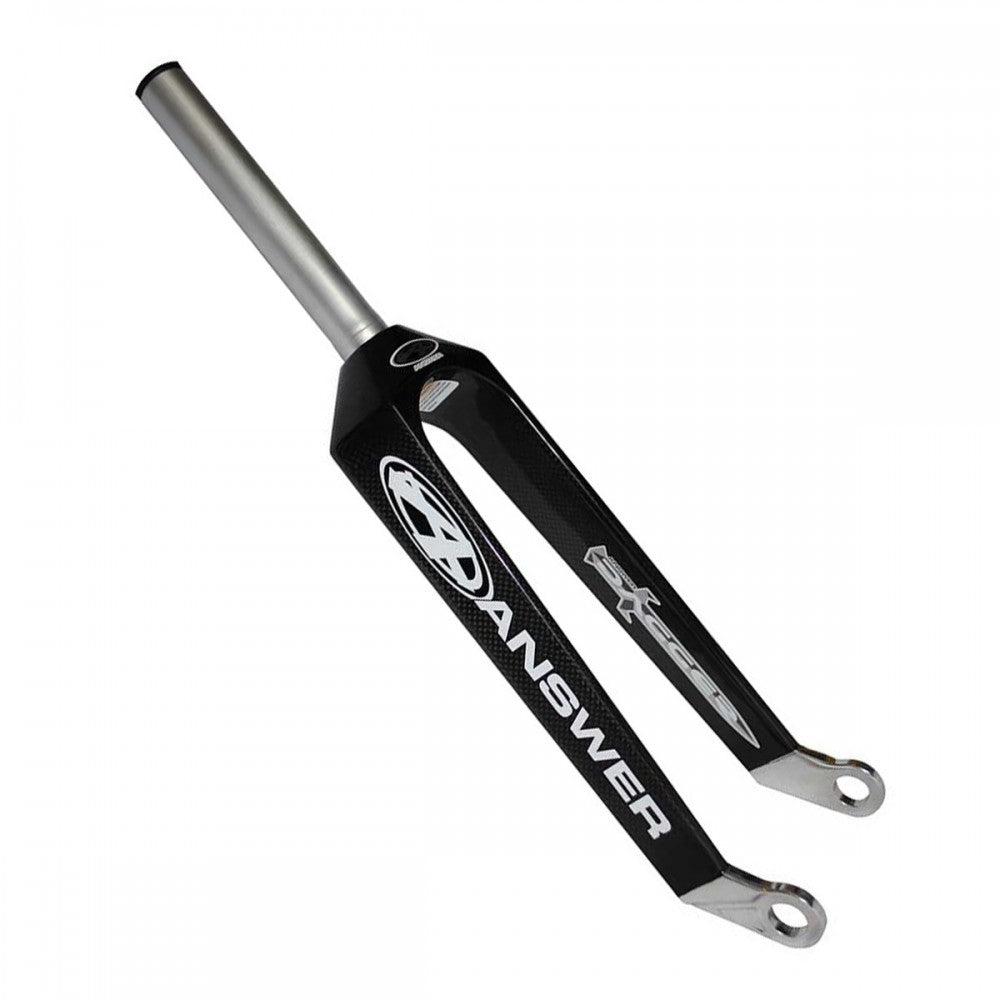 Los tenedores de bicicletas Answer Dagger Carbon BMX son una horquilla de carrera liviana hecha de un tejido de fibra de carbono con número de hilos 4K con un tubo de dirección y corona de aluminio de la serie 7000 de 1 pieza, punteras de aluminio de la serie 7000 con ranuras para eje de 20mm y un dispositivo de compresión incorporado.